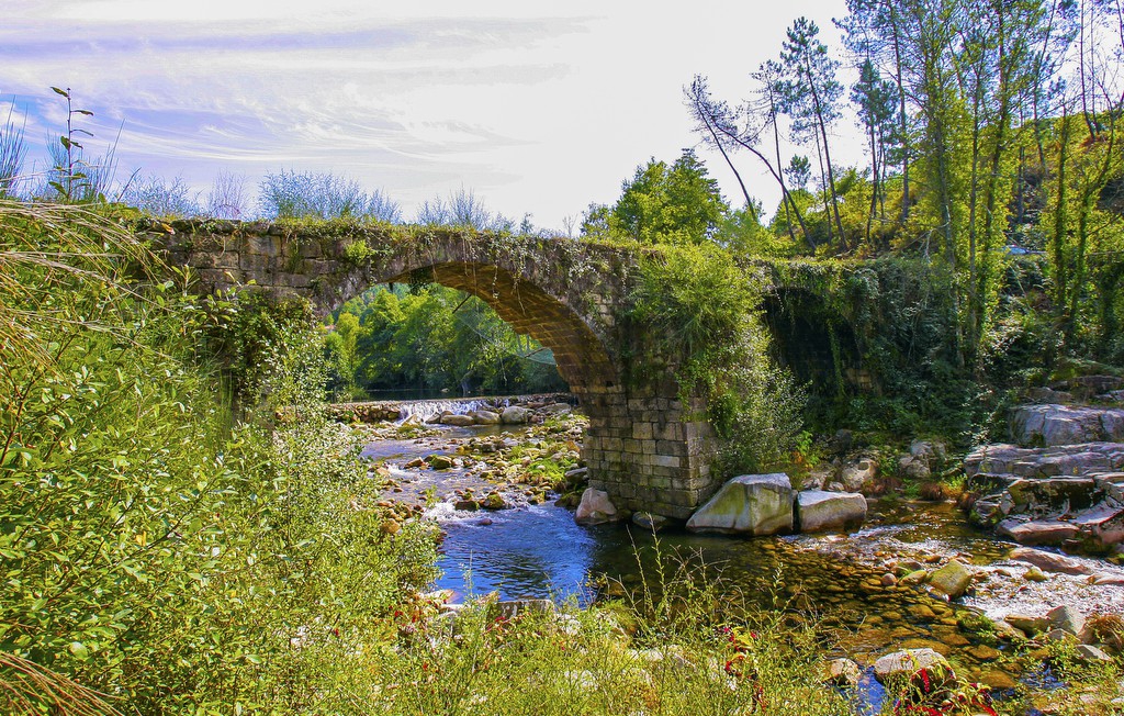 Edificada no século XIII ou XIV e reconstruída por João Rodrigues em 1613, a Ponte de Ázere apresenta-se com o tradicional tabuleiro horizontal sobre dois arcos de volta redonda e aparelho em silhares de granito, apresentando o arco Norte algumas siglas. O arco Sul possui aduelas mais curtas, sendo algumas almofadadas. O típico pegão central com talha-mar encontra-se, de igual modo, presente.
